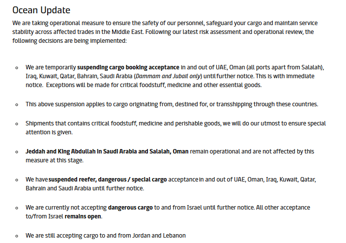 赫伯罗特(Hapag-Lloyd)于3月4日发布通知称,公司决定暂停所有货类往返以下目的地/起运地的新订舱,直至另行通知:阿联酋、伊拉克、科威特、卡塔尔、巴林、阿曼(Sohar)、沙特阿拉伯(Dammam、Jubail)及也门。