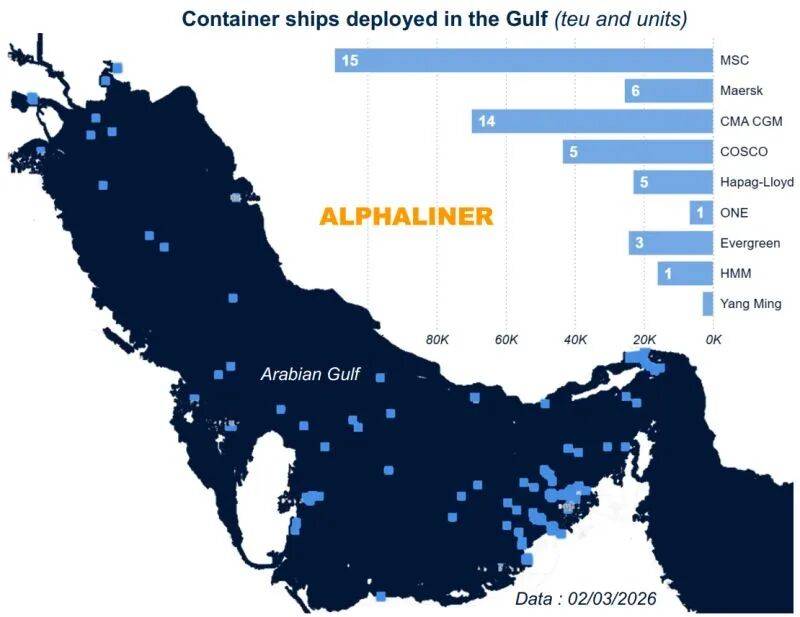 Alphaliner以3月2日的数据统计显示,区域内共有约138艘集装箱船集装箱船运力正在被迫“滞留”,总运力接近47万TEU,在短时间内被锁定在区域内。这相当于在短期内将一批原本参与全球航线周转的船舶运力暂时“锁定”在区域内,对班期和船队调度产生直接影响。