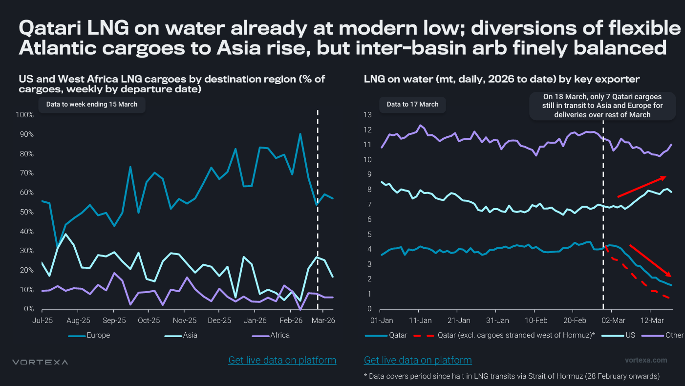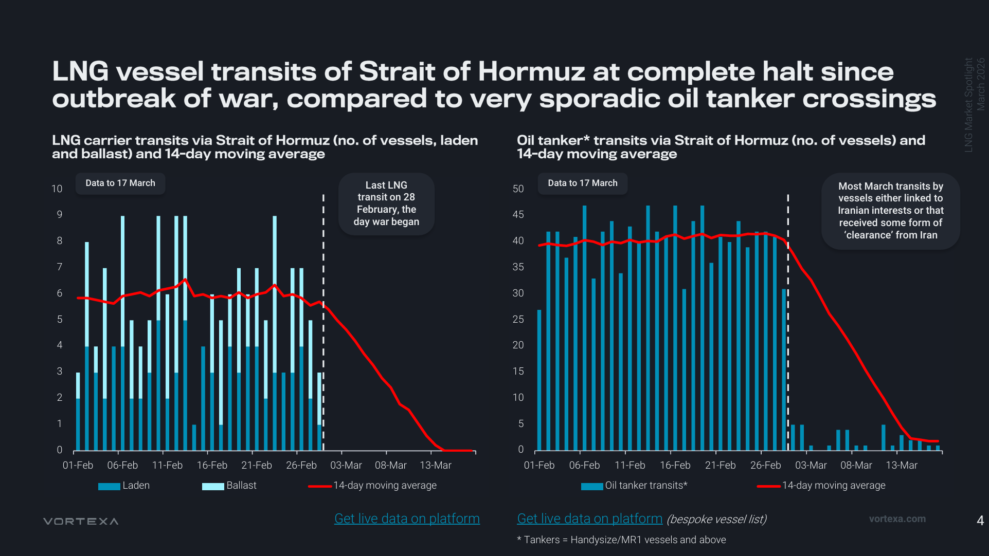从Vortexa的数据看,至少到3月中旬,LNG船通行已经比油轮更早、更彻底地停住;而卡塔尔生产端受损,又让市场失去了“等通道恢复就能回到原位”的基础。