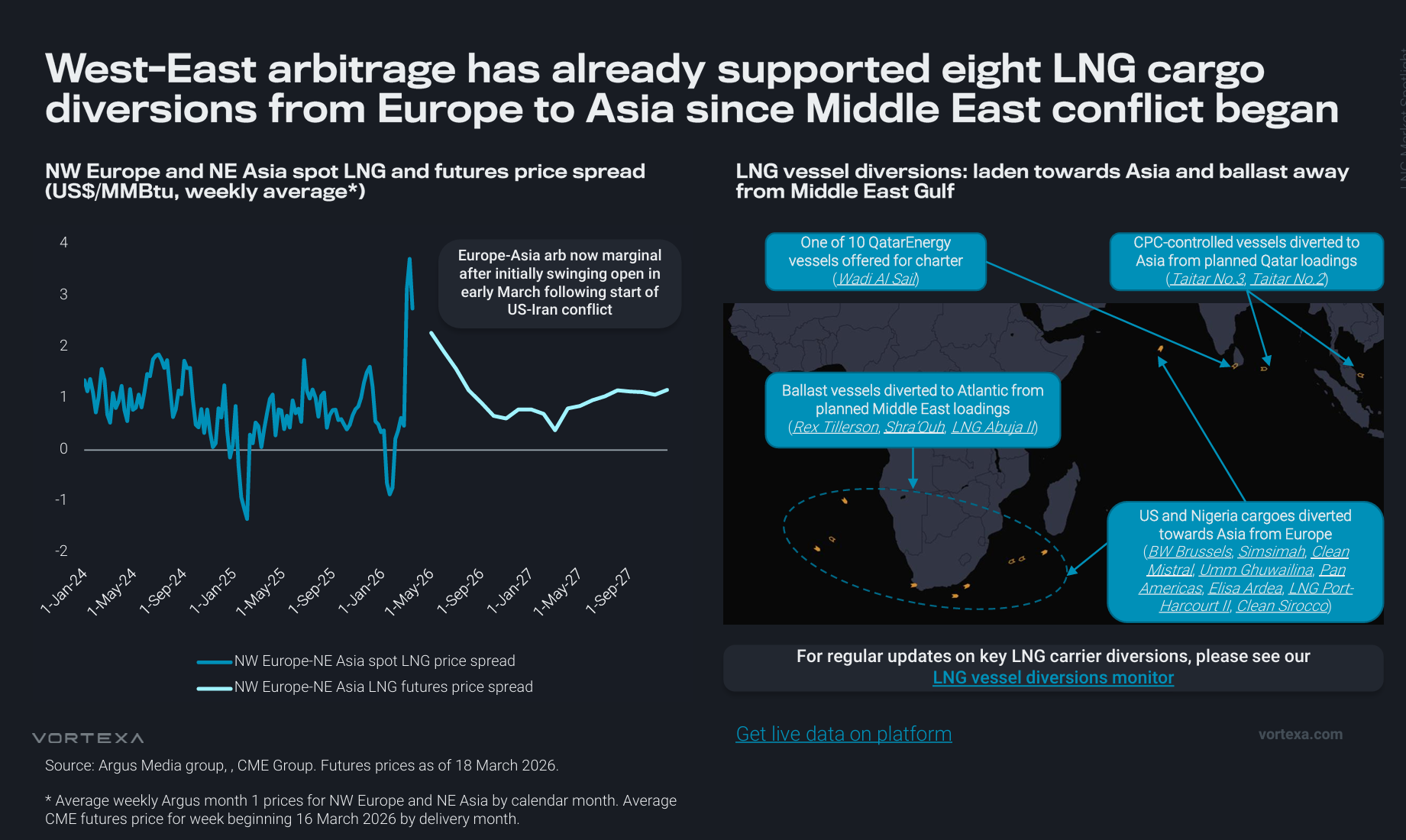 面对海湾供应受阻,市场已经开始通过跨市场调货来补缺口。Vortexa称,自中东冲突开始以来,已有8票LNG 货物从欧洲方向转流亚洲。这背后的逻辑很直接:亚洲买家对卡塔尔和阿联酋LNG依赖更深,且电力体系对天然气依赖更高,因此在中东货源中断后,更容易推高亚洲溢价,并把美国、西非等灵活货源重新吸引回亚洲。