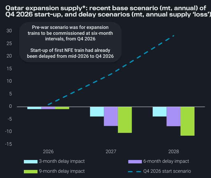 这场冲击的影响,还不只在当下。Vortexa认为,卡塔尔北方气田扩产项目的推进节奏也会受到影响。报告提到,卡塔尔扩产工地约有50%劳动力已被撤离。如果扩产项目出现6个月延迟,再叠加受损产线的中期损失,到2028年全球新增LNG产能可能减少约28 mtpa。