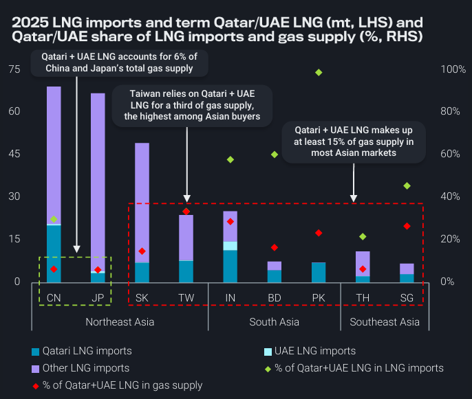 在需求端,Vortexa判断,中国大陆和日本的承压程度相对较低,而其他地区如台湾省、新加坡等东南亚市场受冲击最重。这些市场对天然气发电依赖更高,同时卡塔尔和阿联酋LNG在其气源结构中的占比也更大。报告举例称,台湾省约40%电力来自天然气,且卡塔尔是其最大LNG供应方;新加坡电力结构中天然气占比超过90%,已经开始寻找替代货源;孟加拉则据报已以高于20美元/MMBtu的价格采购3-4月交付现货。