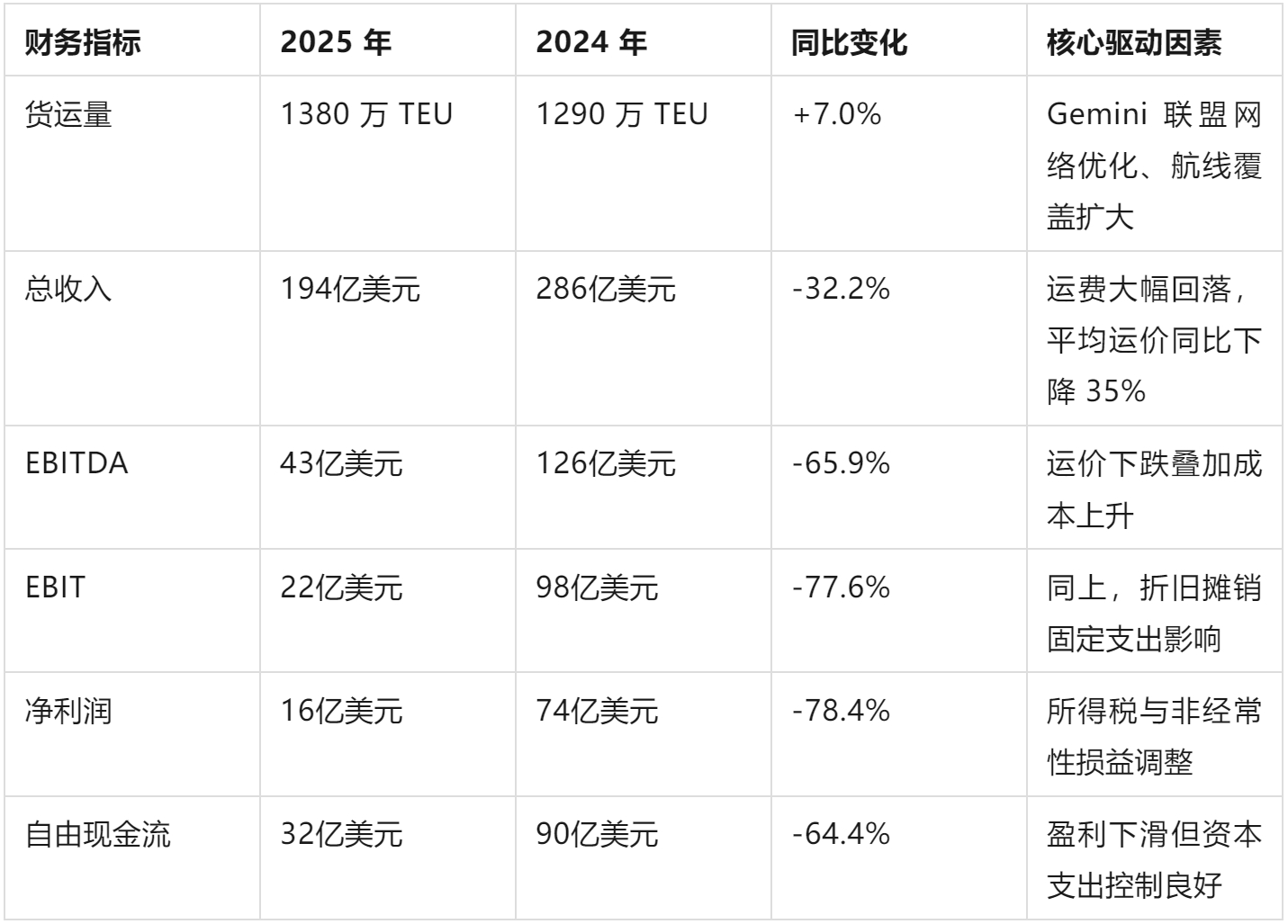 赫伯罗特 2025 年财务数据呈现 "量增利减" 格局,反映出集运市场从疫情后超级周期向常态回归的趋势: