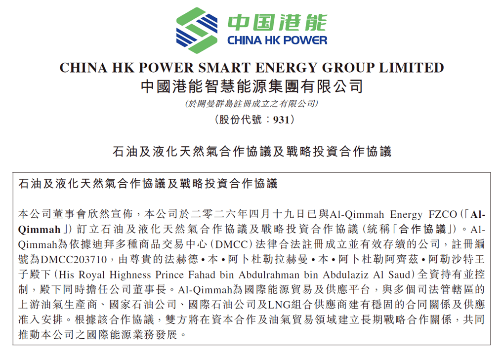 4月21日,中国港能智慧能源集团有限公司(股份代号:00931.HK,下称 “中国港能”)在香港联交所发布正式公告,公司于2026年4月19日与沙特王室旗下 Al-Qimmah Energy FZCO(下称 “Al-Qimmah”)签署石油及液化天然气合作协议、战略投资合作协议,双方将在油气资源贸易、全球资产投资、股权绑定三大领域建立长期战略合作关系。