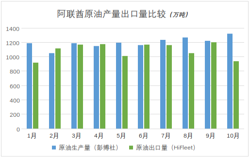 通过HiFleet的提供的数据来看,阿联酋原油产量的91%用于出口。阿联酋本年度前10个月共计出口原油约1.1亿吨,进入亚洲市场的原油共计1亿吨,占阿联酋出口量的91.4%。